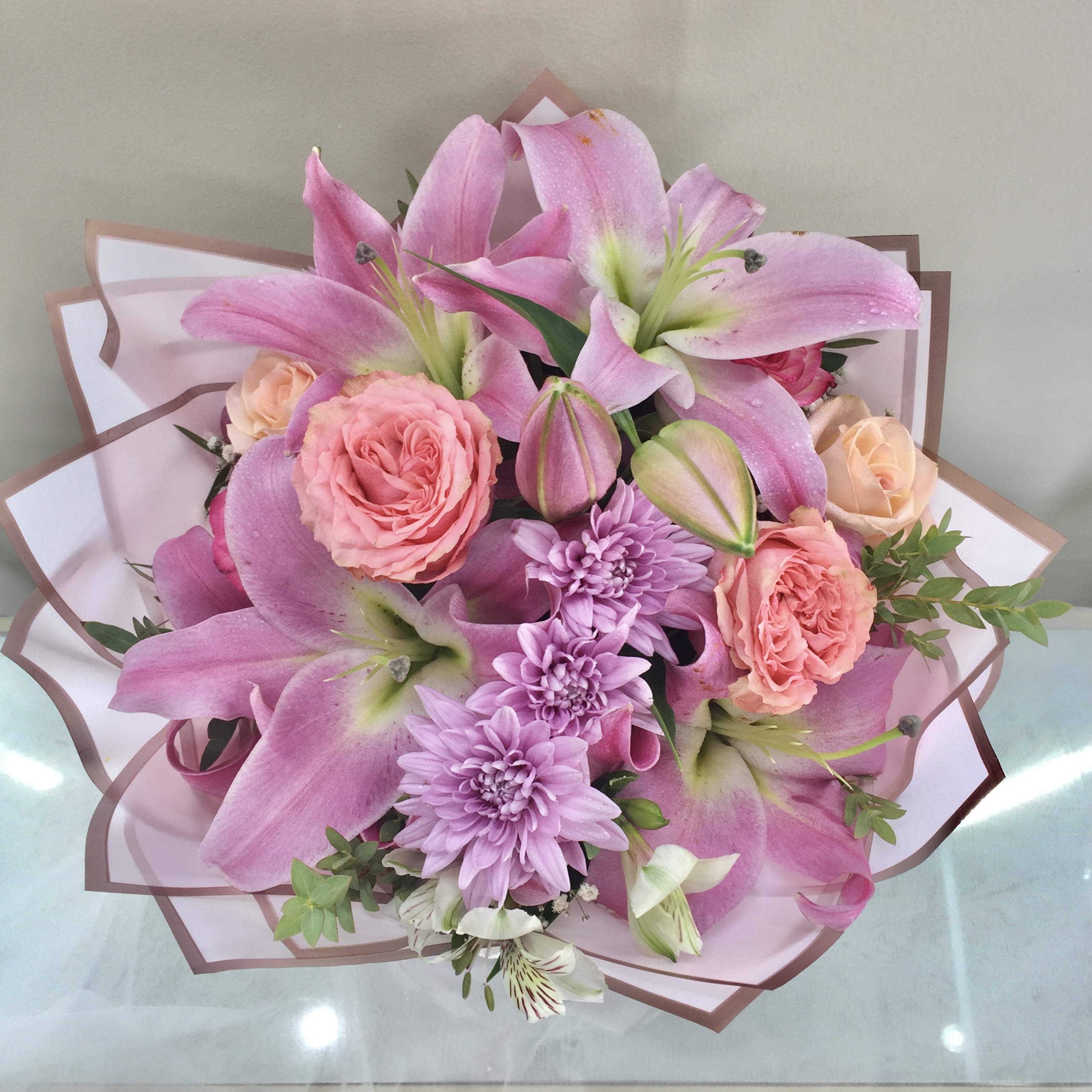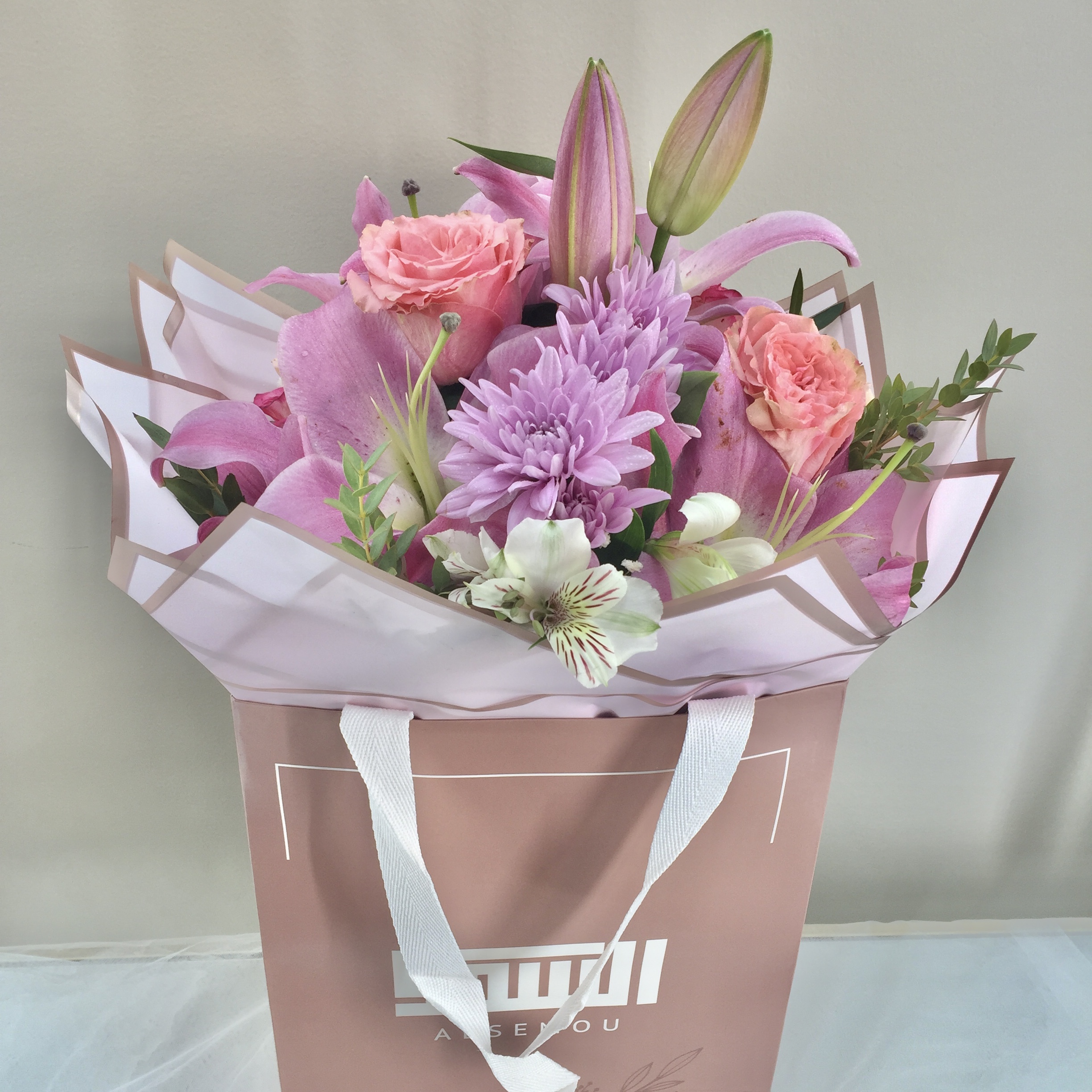 bouquet of roses, lisianthus, protea, carnation and leaves wrap in pink paper